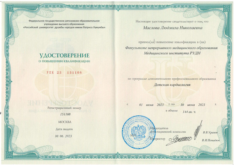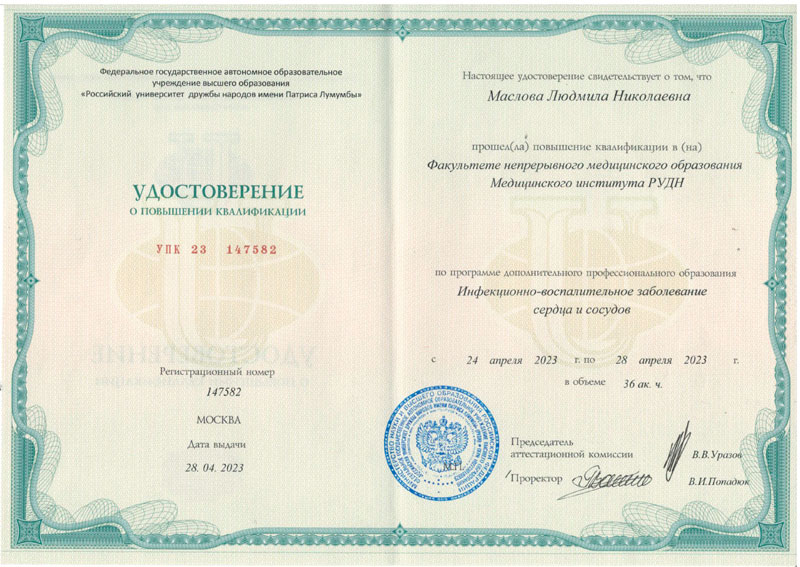 2023 г.- Повышение квалификации , Факультет непрерывного профессионального образования Медицинского института РУДН – Инфекционно- воспалительные заболевания сердца и сосудов