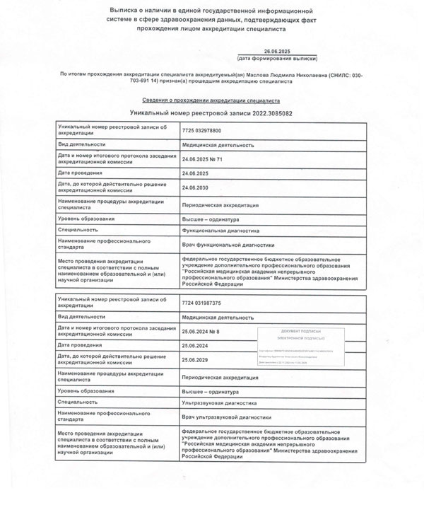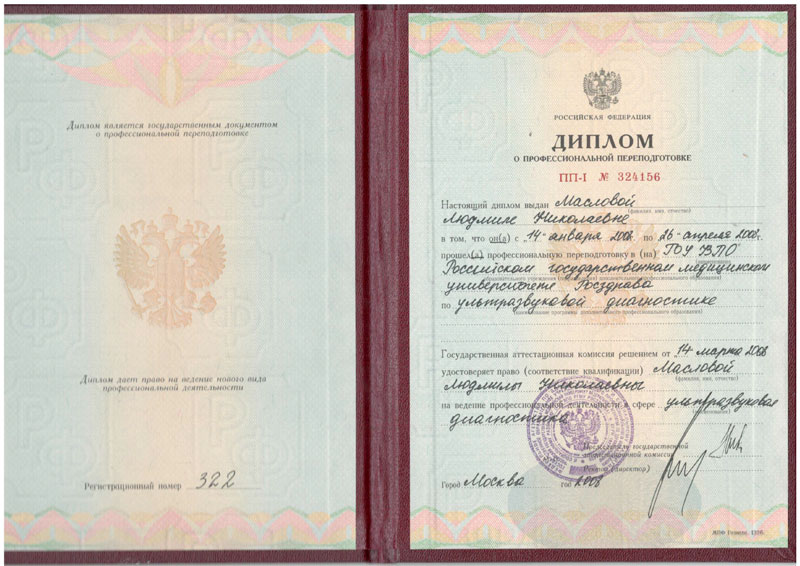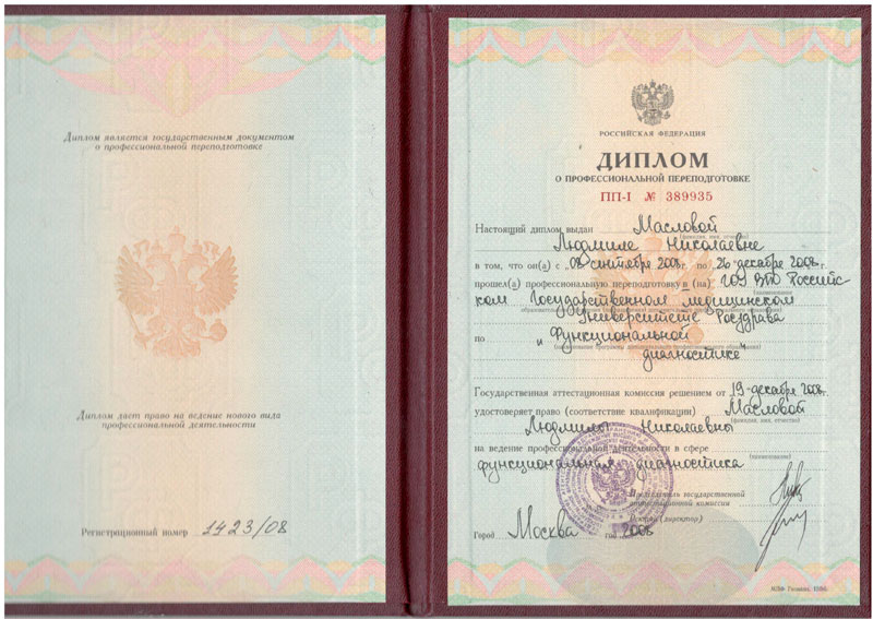 2008 г.- Повышение квалификации в Российском государственном медицинском университете по специальности « Клиническая функциональная диагностика » ( первичная специализация )