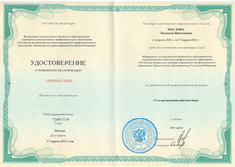 2024 г.- Повышение квалификации в ФБГОУ «Российская медицинская академия непрерывного профессионального образования – Ультразвуковая диагностика