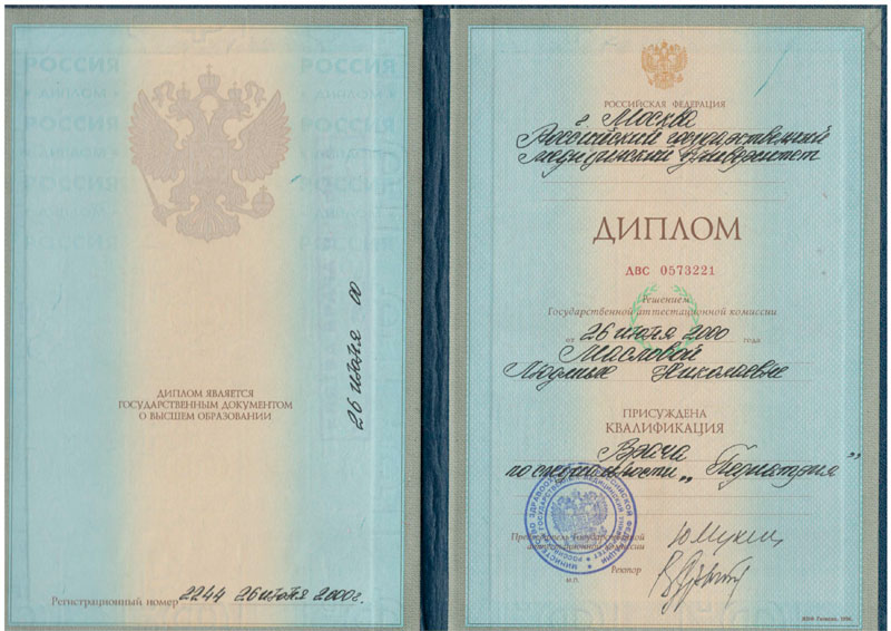 2000 г. – Российский государственный медицинский университет ( РГМУ ) по специальности « Педиатрия »