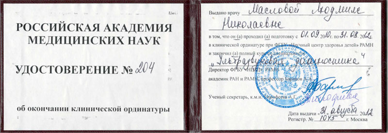 2012 г. - Клиническая ординатура при ФГБУ « Научный центр здоровья детей » РАМН по специальности « Ультразвуковая диагностика »