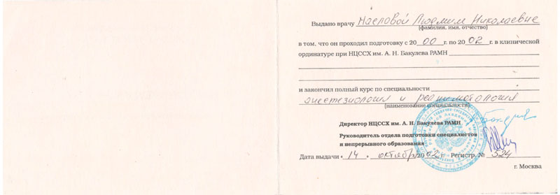 2002 г. – Клиническая ординатура при НЦССХ им. А.Н. Бакулева РАМН по специальности « Анестезиология и реаниматология »