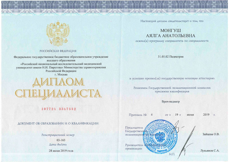 ФГБОУ ВО «Российский национальный исследовательский медицинский университет имени Н.И.Пирогова» МЗ РФ. 2019 г., врач-педиатр