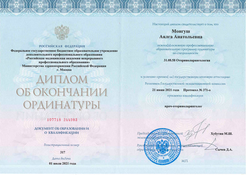 ФГБОУ ДПО «Российская медицинская академия непрерывного профессионального образования» Министерства здравоохранения Российской Федерации. 2021 г., врач-оторино-ларинголог.