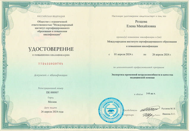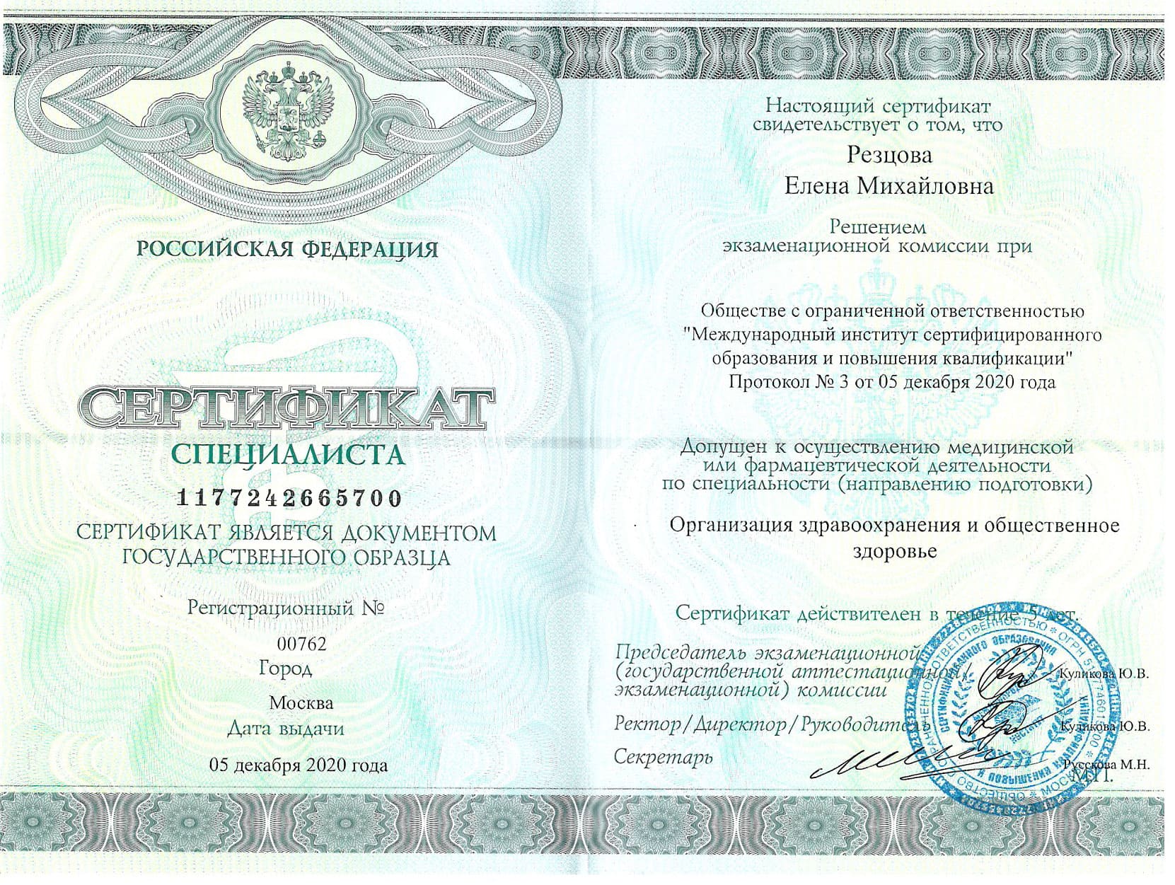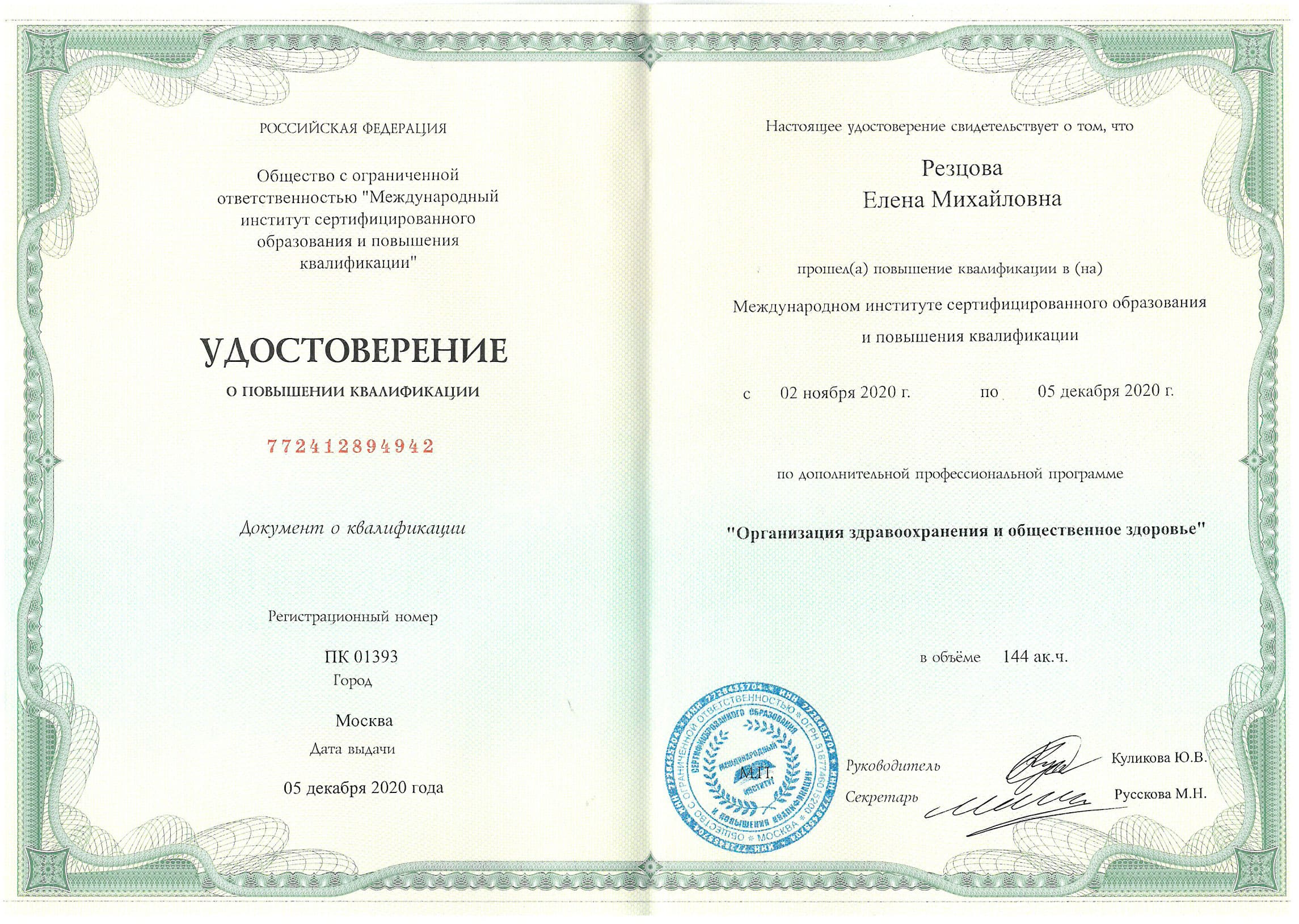 - Сертификат повышения квалификации специализация Организация здравоохранения и общественное здоровье, выдан 05.12.2020г. ООО "Международный институт сертифицированного образования и повышения квалификации", действителен до 04.12.2025г.