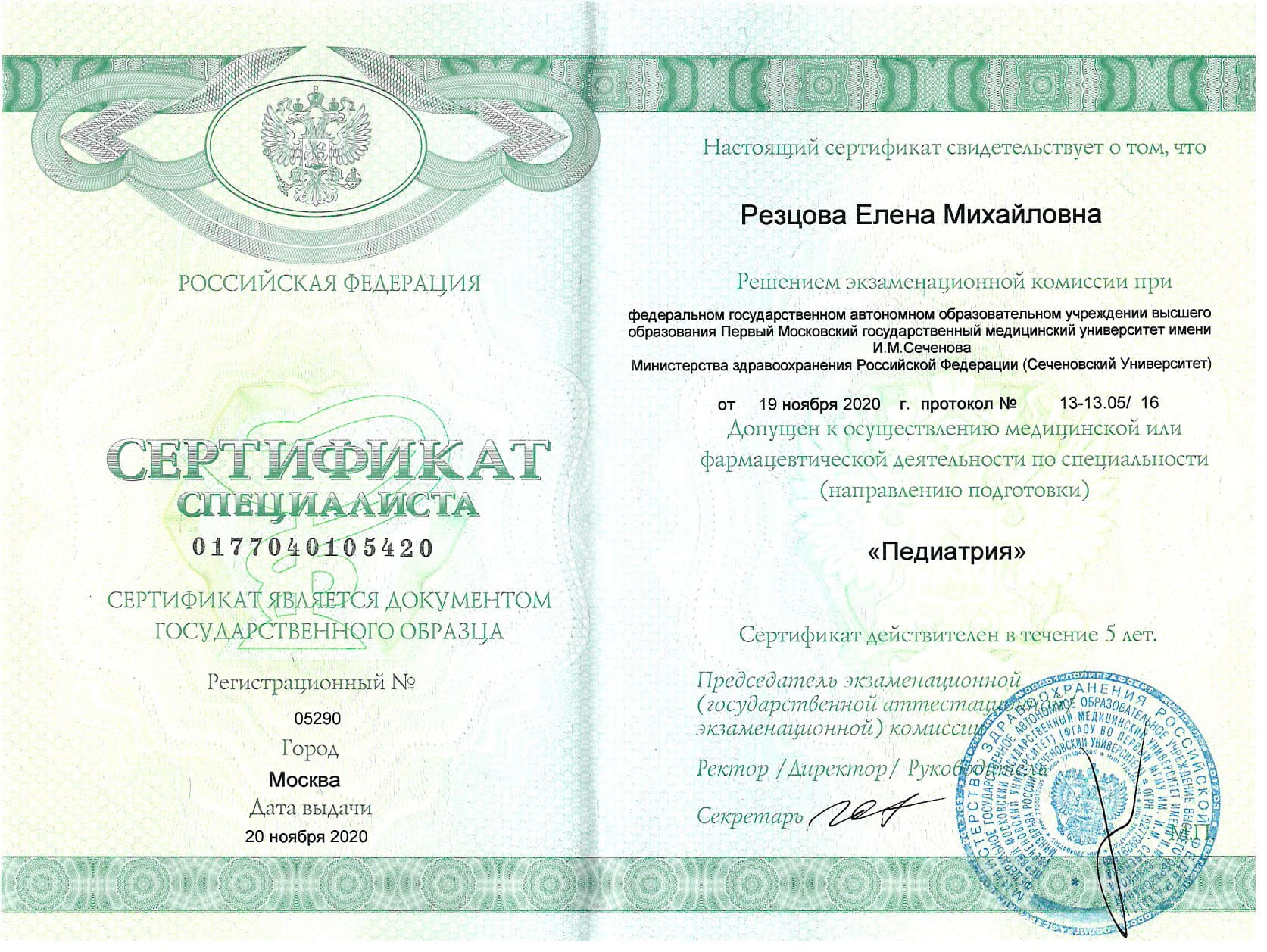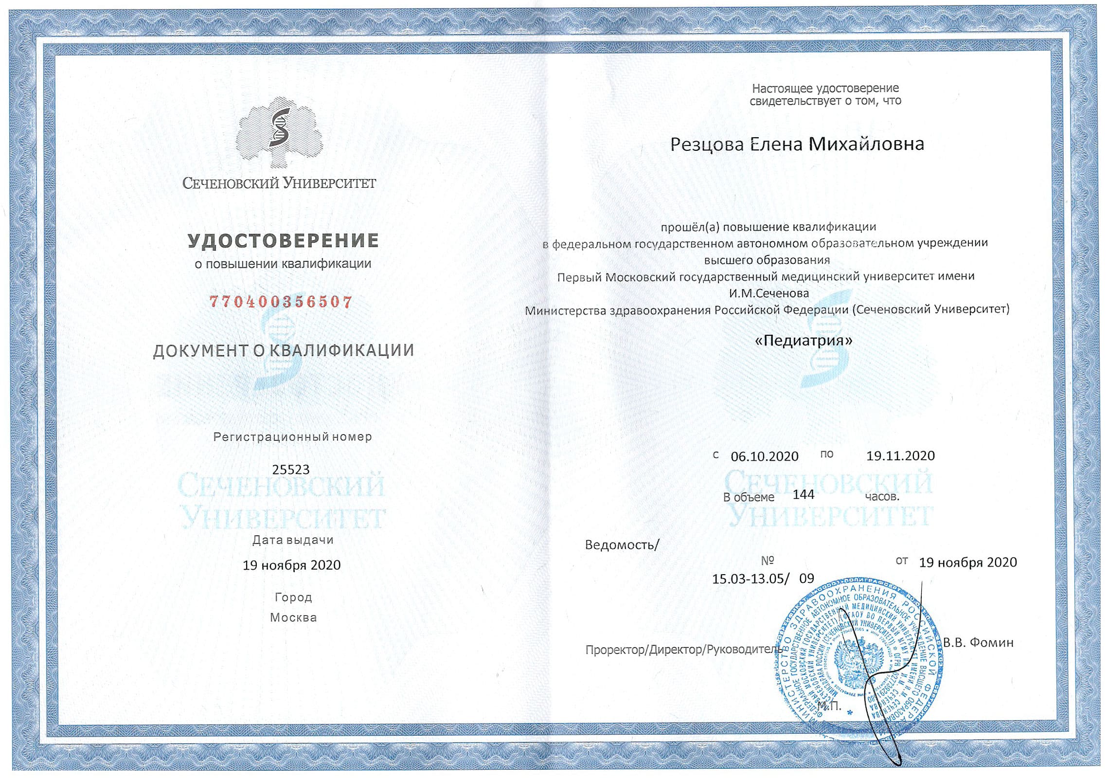 - Сертификат повышения квалификации специализация Педиатрия, выдан 20.11.2020г. ФГАО УВО Первый Московский государственный медицинский университет им И.М. Сеченова, действителен до 19.11.2025г.
