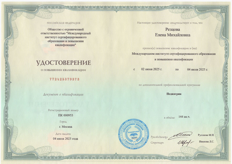 - Сертификат повышения квалификации специализация Педиатрия, выдан 13.02.26г. Международный Институт Сертифицированного Образования и Повышения Квалификации