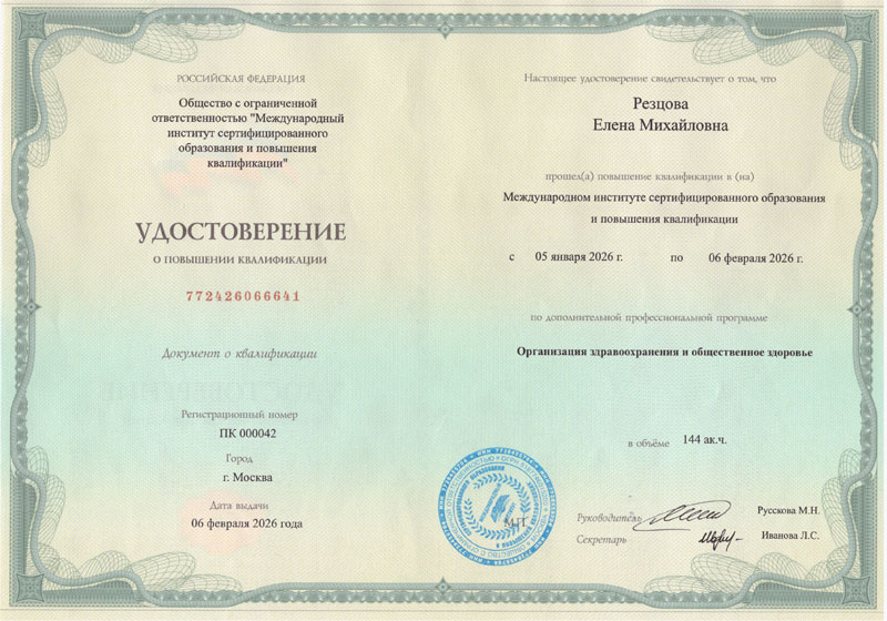 - Сертификат повышения квалификации специализация Организация здравоохранения и общественное здоровье, выдан 06.02.26г. Международный Институт Сертифицированного Образования и Повышения Квалификации