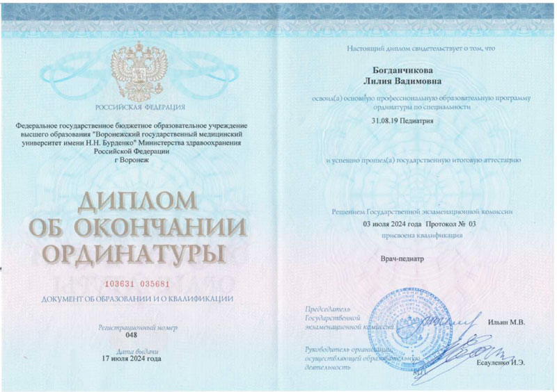 - 2024г. - Воронежский Государственный Медицинский Университет им. Н.Н. Бурденко, Педиатрия, Ординатура