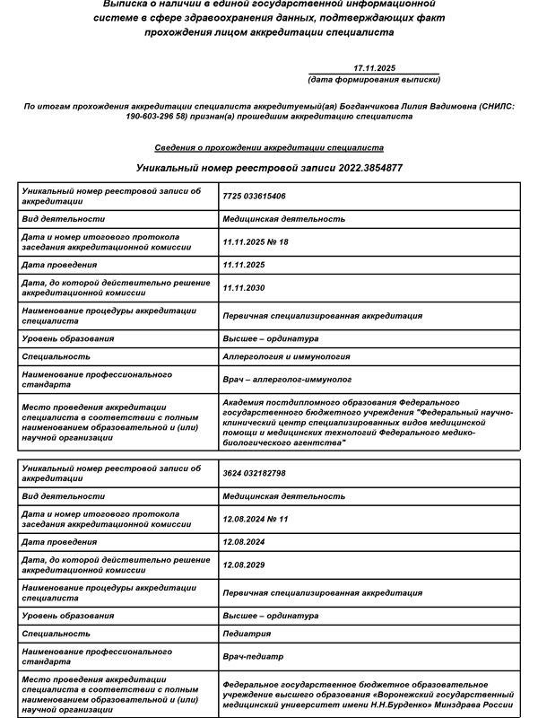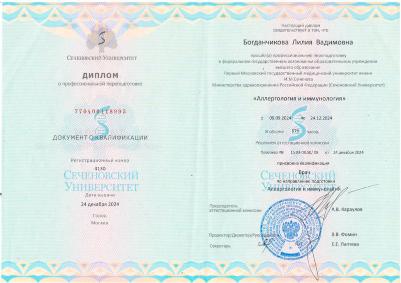 - 2024г. - Первый Московский государственный медицинский университет им. И.М. Сеченова, Аллергология и иммунология, Циклы переподготовки