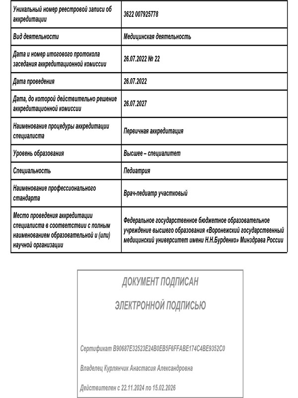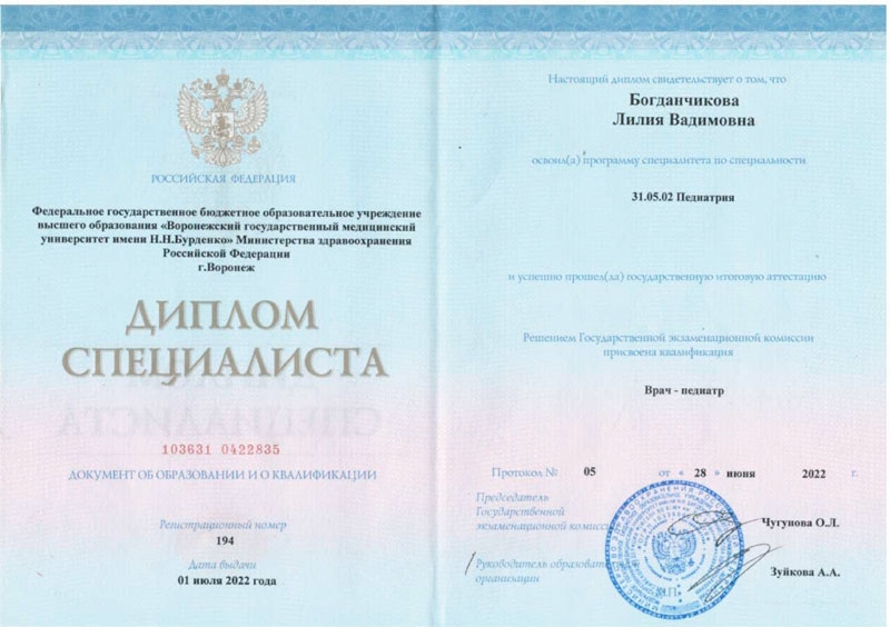 - 2022 г. - Воронежский Государственный Медицинский Университет им. Н.Н. Бурденко, Педиатрия, Базовое образование