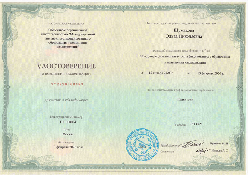 Сертификат повышения квалификации специализация Педиатрия, выдан 13.02.26г. Международный Институт Сертифицированного Образования и Повышения Квалификации