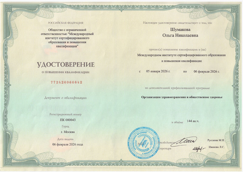 Сертификат повышения квалификации специализация Организация здравоохранения и общественное здоровье, выдан 06.02.26г. Международный Институт Сертифицированного Образования и Повышения Квалификации