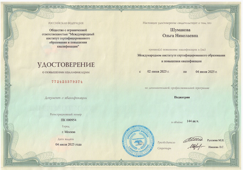Сертификат повышения квалификации специализация Педиатрия, выдан 05.12.2020г. ООО "Международный институт сертифицированного образования и повышения квалификации", действителен до 04.12.2025г.