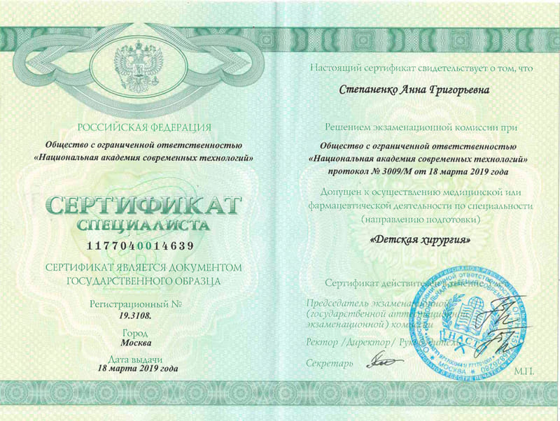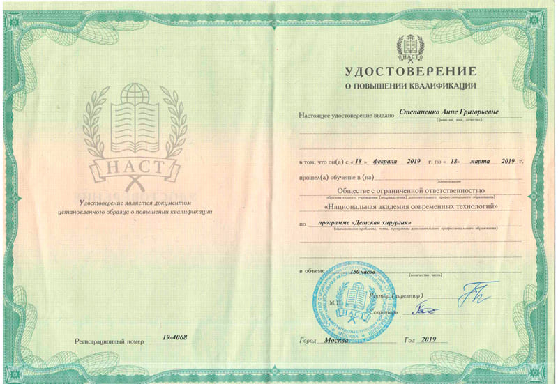 - Сертификат специалиста – курсы повышения квалификации – детская хирургия «Российский национальный исследовательский университет имени Н.И. Пирогова», 2014г.