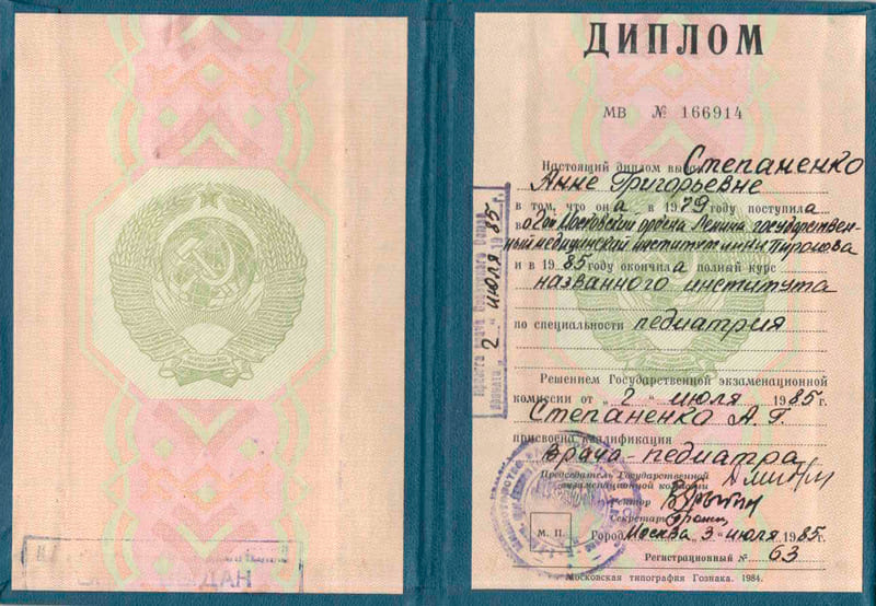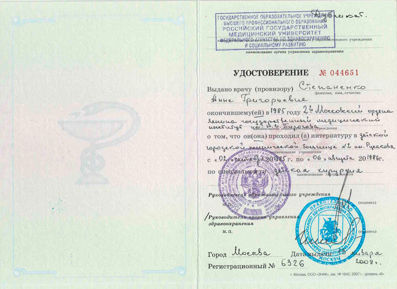 - Интернатура, детская хирургия, 2-й МОЛГМИ им. Н.И. Пирогова (1986г.)
