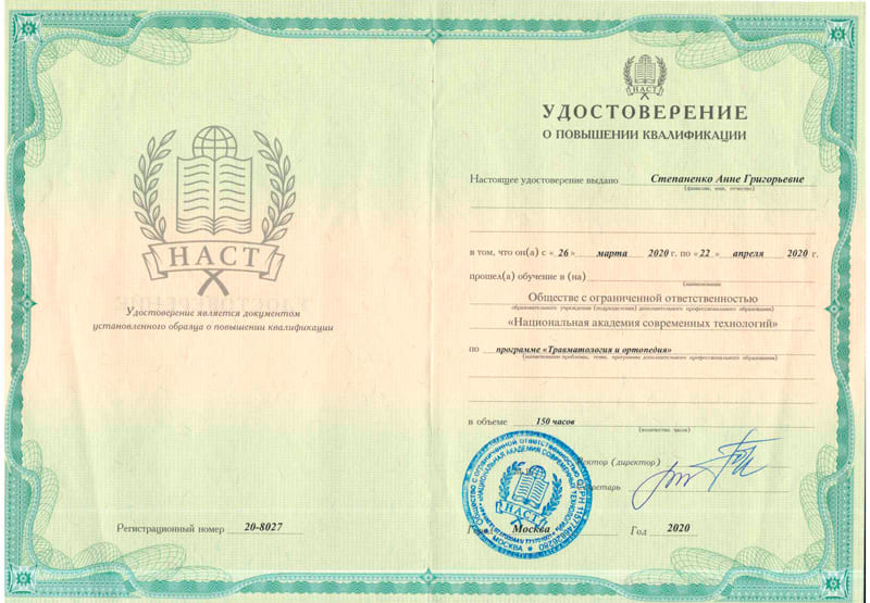 - 2020г. - повышение квалификации по травматологии и ортопедии;