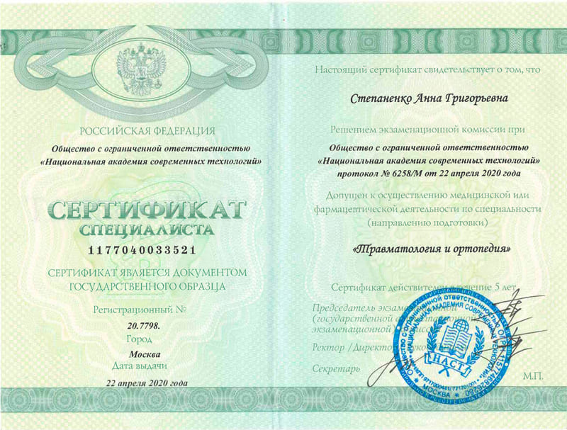 - Сертификат специалиста – курсы повышения квалификации – травматология и ортопедия «Российская медицинская академия последипломного образования», 2015г.