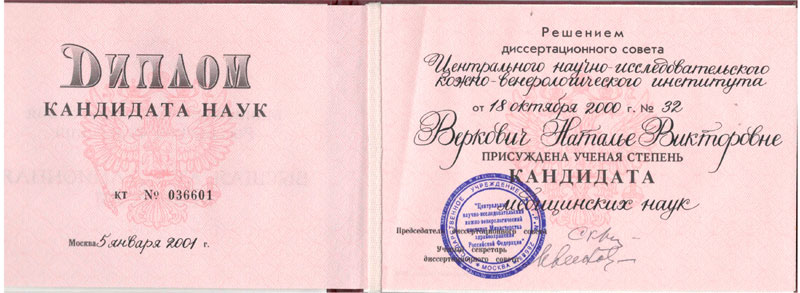 - 2000 г. – кандидат медицинских наук Центральный научно-исследовательский кожно-венерологический институт Министерства здравоохранения Российской Федерации.