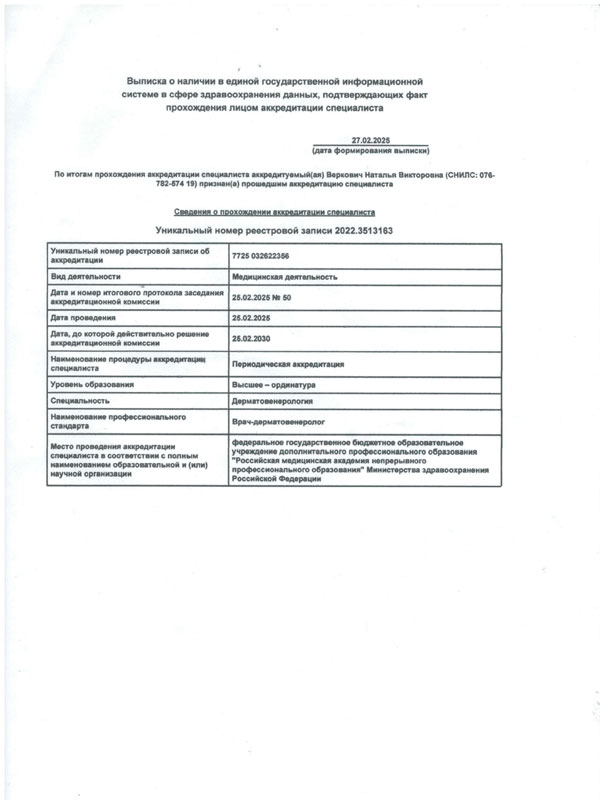- 2025 – аккредитована по специальности «Дерматовенерология». Единая государственная информационная система в сфере здравоохранения.