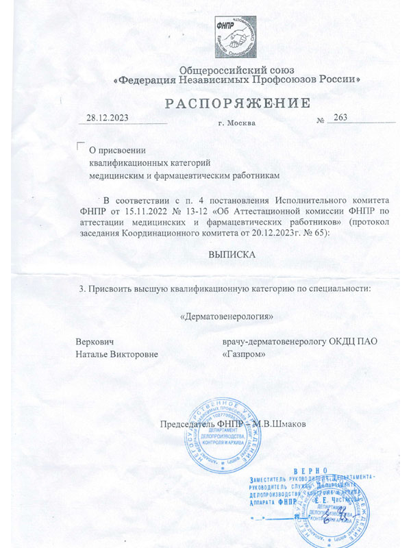 - 2023 – врач высшей квалификационной категории по специальности «Дерматовенерология». Исполнительный комитет «Федерации Независимых Профсоюзов России».