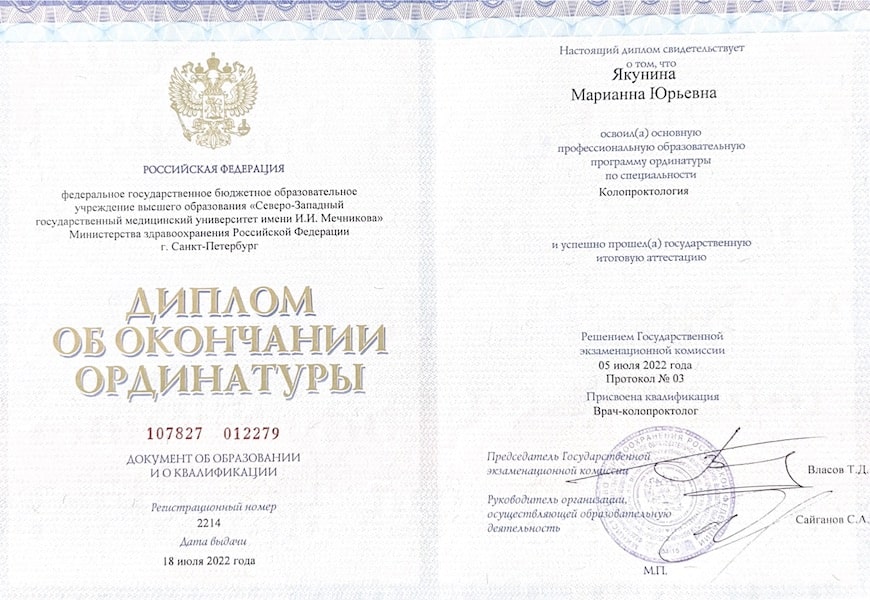 - 2022 г. – Ординатура по специальности «Колопроктология», врач-колопроктолог, Северо-Западный государственный медицинский университет им. И.И. Мечникова