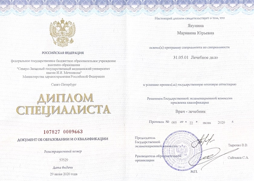 - 2020 г. – «Лечебное дело», врач-лечебник, Северо-Западный государственный медицинский университет им. И.И. Мечникова